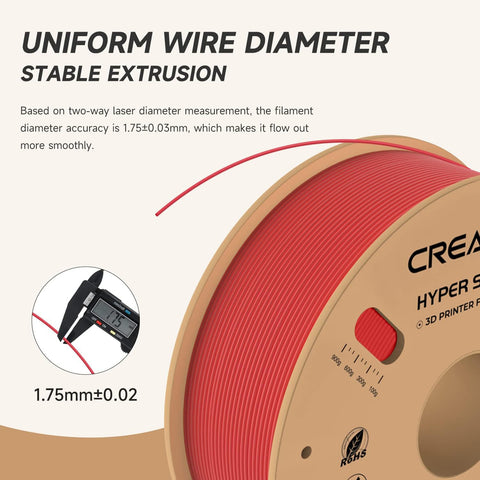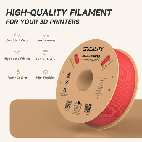 Creality Hyper PLA 1.75mm 3D Printer Filament - Red (1kg Spool) Print faster and more precisely with Creality Hyper PLA! Designed for high-speed 3D printing (up to 600mm/s), this filament offers superior dimensional accuracy, excellent layer adhesion, and enhanced strength—ideal for hobbyists and professionals alike. Product Specifications Property Value Product Name Hyper Series PLA Color Red Wire Diameter 1.75±0.03mm Net Weight 1kg (2.2lb) Gross Weight 1.29kg (2.8lb) Package Size 210×210×70mm Printing Temperature 190-230°C Hot Bed Temperature 25-60°C Printing Speed 30-600mm/s Fan 100% Printing Platform Carbon Silicon, PEI, Textured Paper, PVP Glue Density 1.25g/cm³ Tensile Strength (X-Y) 53MPa Elongation at Break 6.3% Bending Strength (X-Y) 92.38MPa Flexural Modulus (X-Y) 2490.18MPa Charpy Impact Strength (X-Y) 8.83kJ/m2 Works With Creality K1, K1 Max, Ender-5 S1, and more Anycubic Kobra 2 Series ELEGOO Neptune 4 Bambu 3D Printers AnkerMake M5 & M5C Flashforge Adventurer 3 Pro2 & 4 Pro Prusa, Monoprice, FLSUN, Artillery, Qidi MAX3, and most 1.75mm high-speed printers