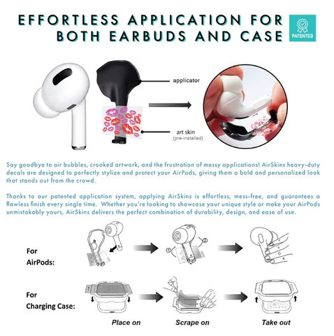 Installing AirSkins is effortless thanks to the patented bubble-free application system. Simply use the included applicator for a smooth, flawless finish. When you’re ready for a change, AirSkins can be removed easily without leaving any sticky residue behind. The skins are also wireless charging friendly, ensuring your AirPods remain functional and stylish.